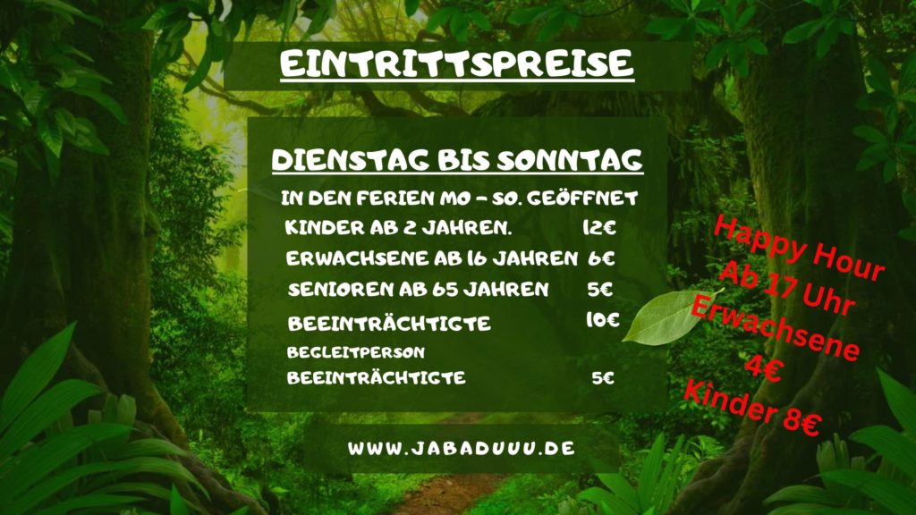 "Wir hatten gestern einen fantastischen Tag im Jabaduuu! Meine beiden Kinder waren total begeistert von den Klettergerüsten und Rutschen. Alles ist so gestaltet, dass man sich wirklich wie im Dschungel fühlt. Das Personal war freundlich und hilfsbereit. Wir kommen definitiv wieder!"